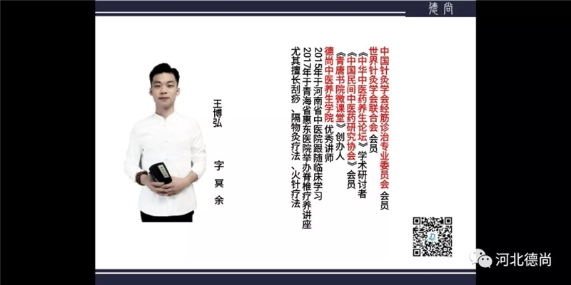 王博弘,中国针灸学会经筋诊治专业委员会会员、世界针灸学会联合会员、《中华中医药养生论坛》学术研讨者、《中国民间中医药研究协会》会员、《青唐书院微课堂》创办人、德尚中医养生学院优秀讲师。2015年河南省中医院跟随临床学习、2017年于青海省惠东医院举办脊椎疗养讲座,尤其擅长刮痧、隔物灸疗法、火针疗法,在中医养生方面拥有丰富经验。 以下是德尚中医美容特约培训顾问: