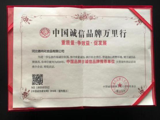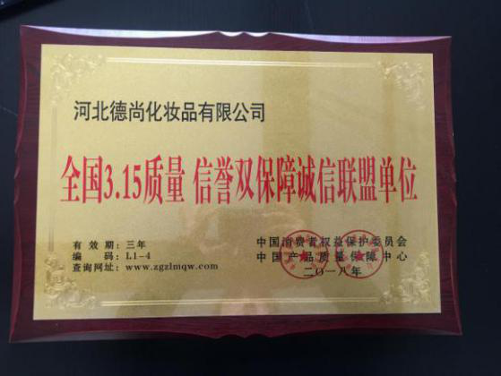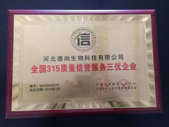 四、公司荣誉: 2015年-2016年德尚获选央视网广告合作伙伴 全国3.15质量 信誉双保障诚信联盟单位 中国品牌日诚信品牌推荐单位 全国315质量信誉服务三优企业 中科院健康中国精准技术支持计划——定点技术支持单位 2019年获选国医大师李佃贵传承工作室、国医大师唐祖宣工作室 2020年被评选为“石家庄市现代农业园区”